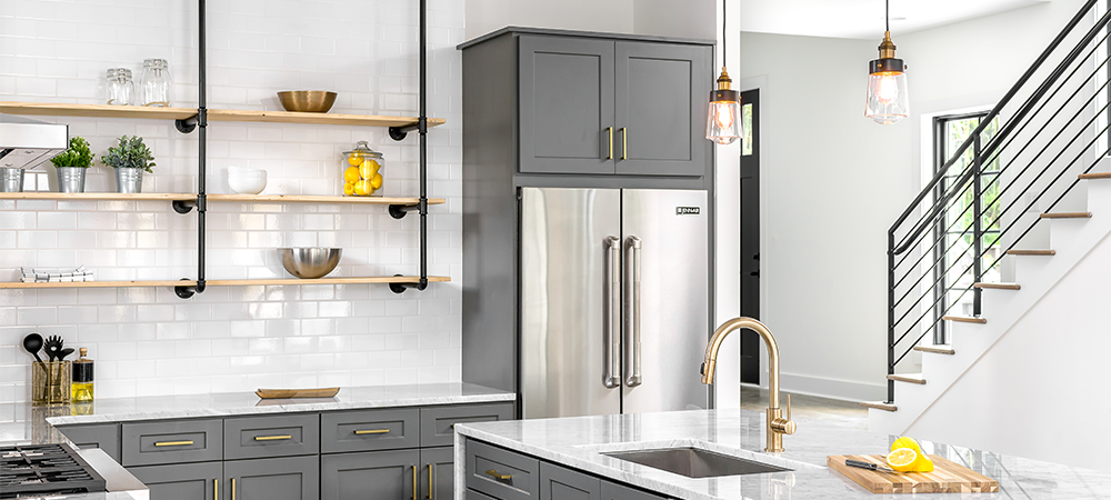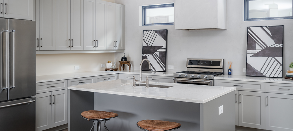 - Monochromatic Cabinet & Walls – Shaker Gray Cabinets + Light Gray Walls